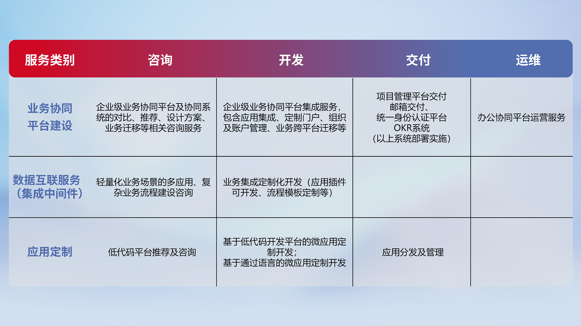 针对钉钉、、企微、、、IDaas等平台级产品提供产品的规划、、、、方案、、、交付、、、定制化开发等服务,,,,实现如统一协同办公、、智能客户服务、、、、混合会议管理、、、智能数据查询、、、等业务场景,,实现数字化转型。。