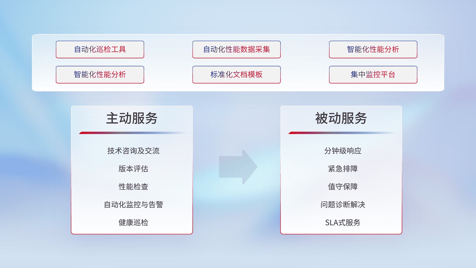智能化工具和标准化文档,,保障服务质量,,,提供主动服务(包含技术咨询、、版本评估、、、性能检查、、自动化监控与告警、、、健康巡检)和被动服务包含(分钟级响应、、、紧急排障、、、值守保障、、、问题诊断解决、、、、SLA服务)。。